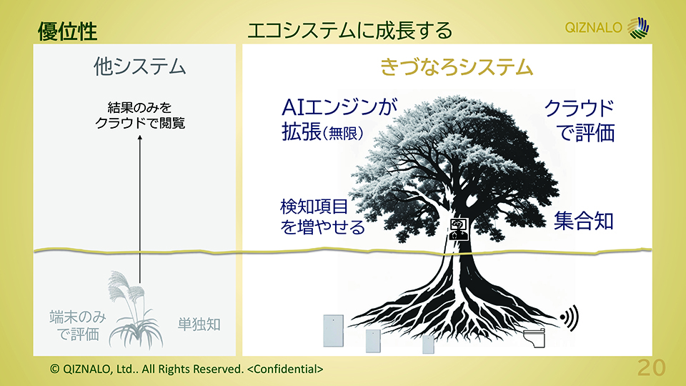 「蓄積したデータはお医者さんの診察や診断に使えるので、ゆくゆくはそうした連携も視野に入れています。ただし、お医者さんによって知りたいパーソナルヘルスレコードは違うので、きづなろのAIクラウドにアクセスして日常動作の履歴やバイタルの状況を確認してもらいます。それにより、その人が倒れたのは運動機能の劣化なのか、別の理由なのか等を診断の材料にできる。今は『器』を用意した段階で、これから提携業者を増やしながら有用なソリューションをインテグレートした統合AIクラウドをエコシステムとして成長させていきます」