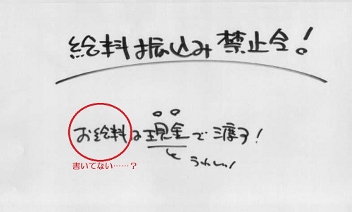それはそれとして、このアイデアを「云い換え」ていきます。このアイデアスケッチのどの辺が「入れ換える対象」になるのでしょう? ベースとなるのは、実際に記載されている情報です。つまりは「給料」「振込み」「禁止」。さらには「現金」「渡す」など。