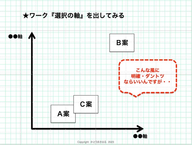 なお、選択基準が一つだけ、一軸のこともあれば、二軸になることもあります。これは状況に拠りますね。漏れをなくしたい! と考えると3つ以上の基準を使って、「総合的」に判断したくもなります。否定はしませんし、3つ以上になる現実もあるでしょうけれど、できれば選択基準の優先順位は上位2つぐらいまでに限定しておいた方が後工程は楽になる、というかスッキリする、とは思います。後ほど再度触れますが、いわゆる「ドングリの背比べ」状態に陥ってしまうこともあるからです。